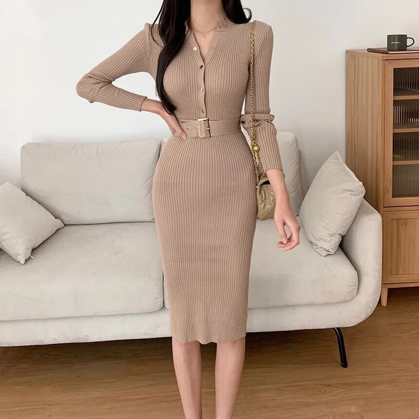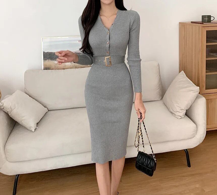 イブニングタイトニットドレス[Blue,Black,Brown,Gray]